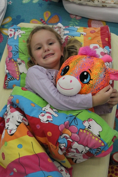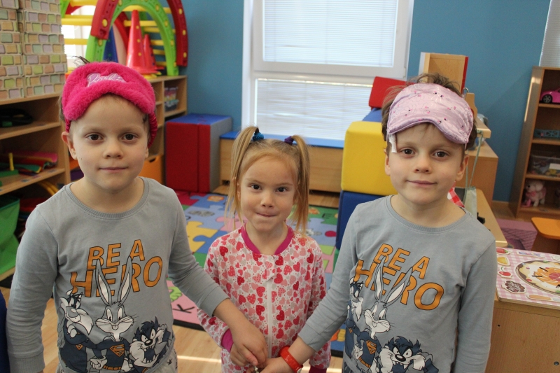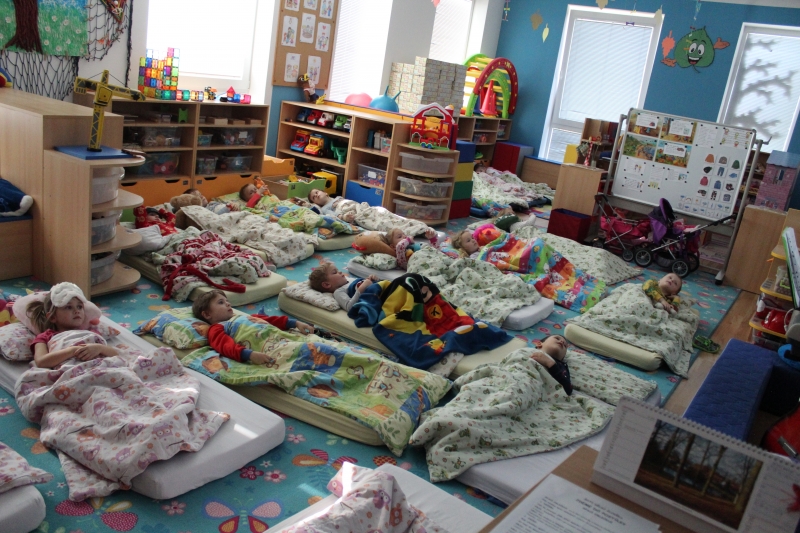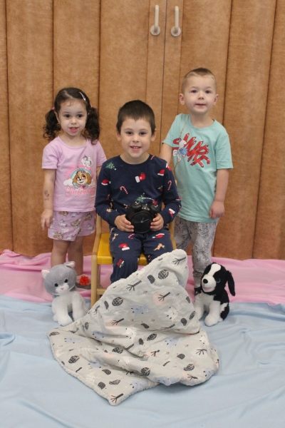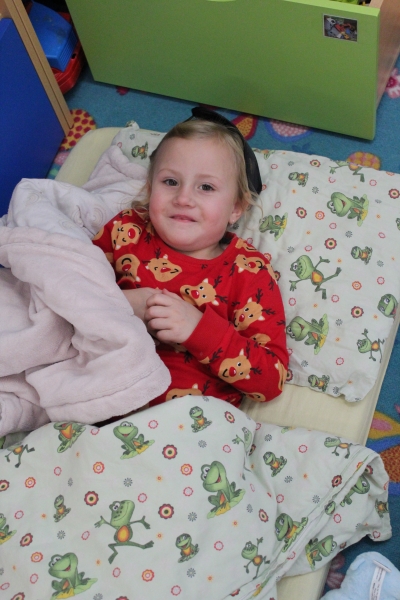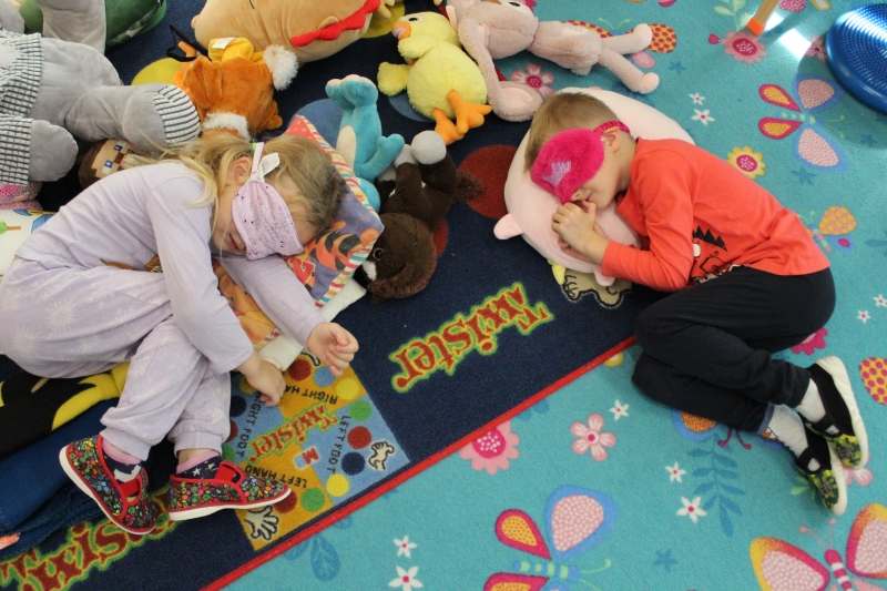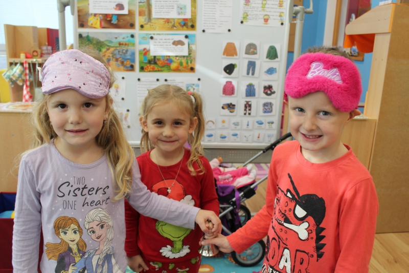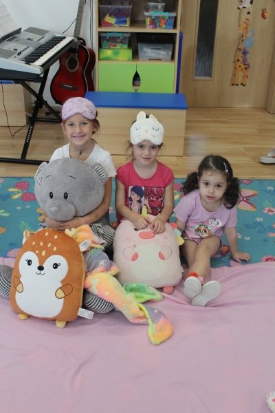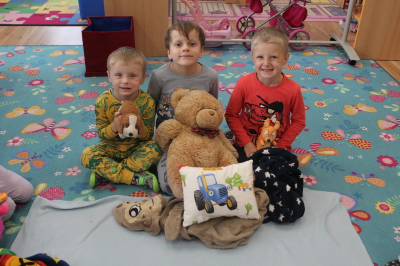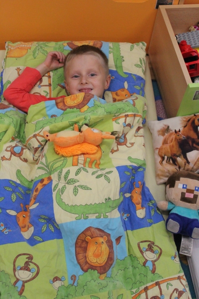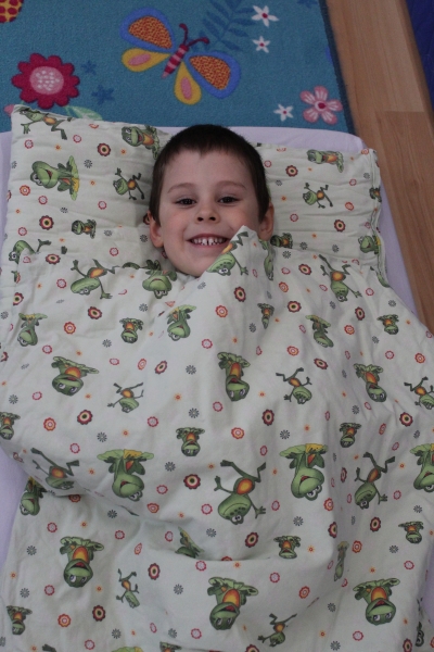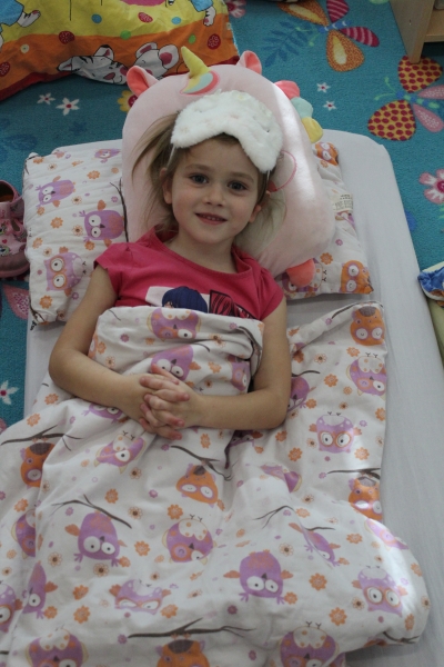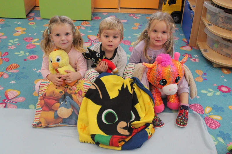 Třetí projektový den děti přišly ve spacím oblečení. Měly krásná pyžama, overaly i noční košili. Po přehlídce nočních úborů si děti zahrály pohybovou hru „Na vrabce a hlídače“ a šly na večeři, vlastně na svačinu. Potom potmě v noci hledaly maminku, také si zahrály na ježka. Před spaním si rozestlaly postýlky a podívaly se na pohádku „Čas jít spát“ z cyklu Prasátko Peppa. Také si vyrobily housenku.