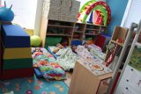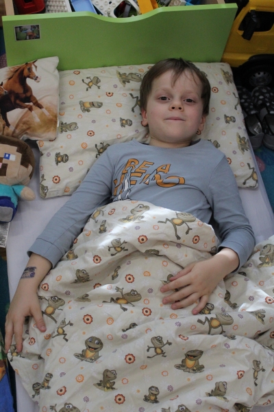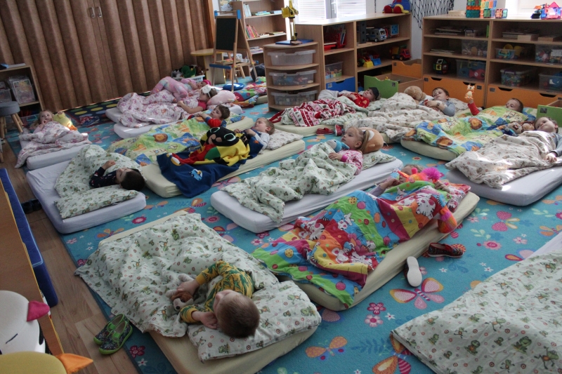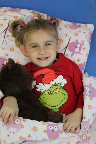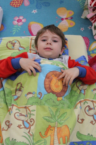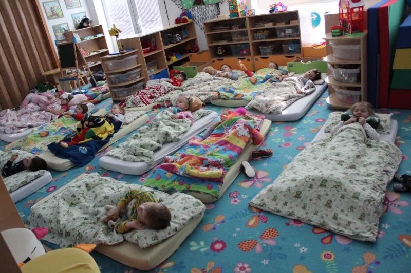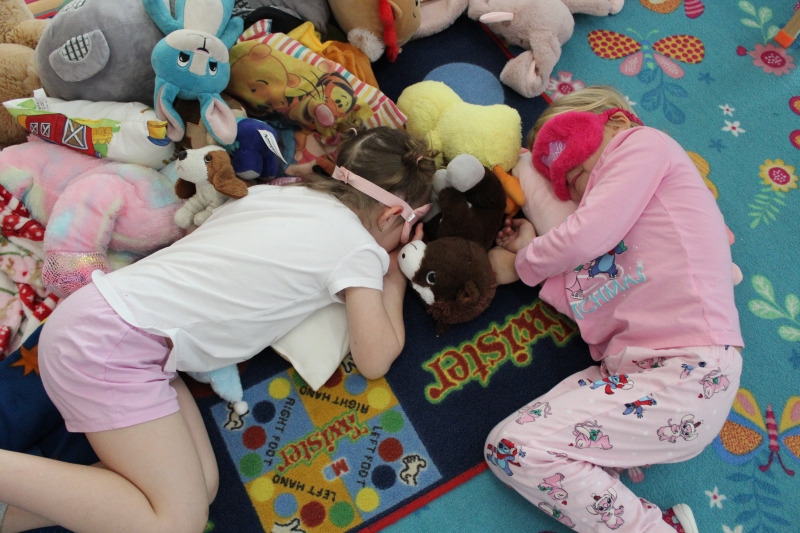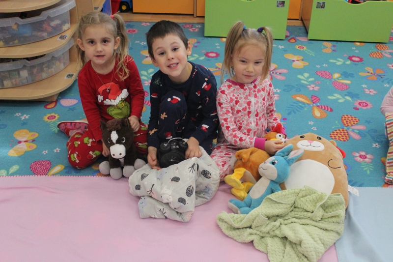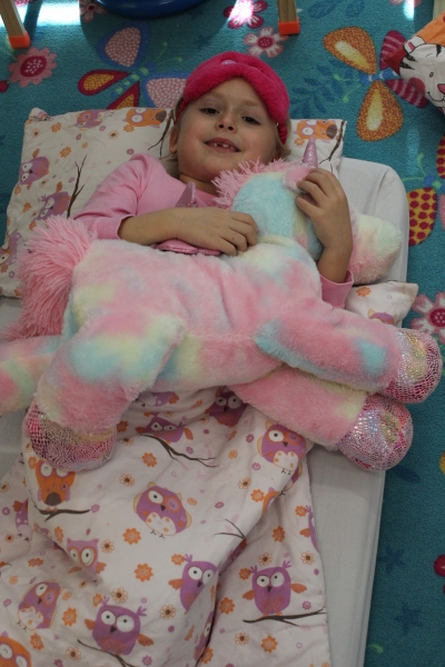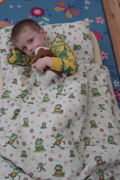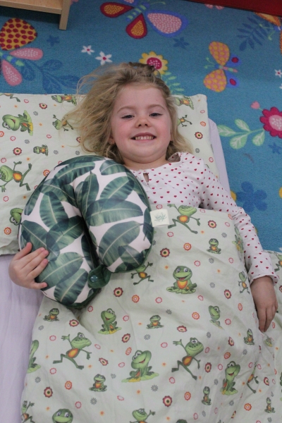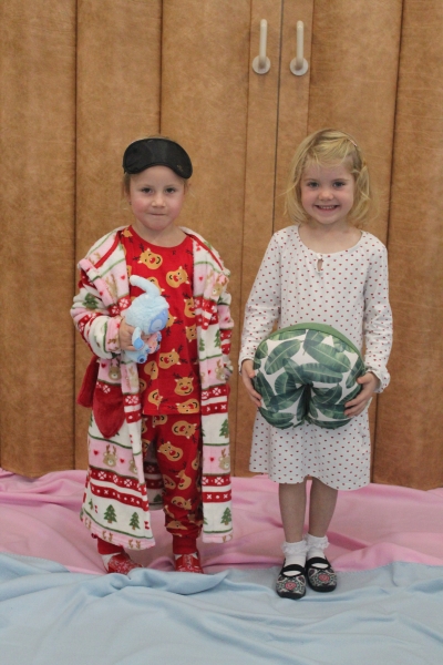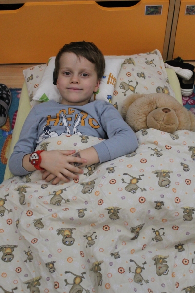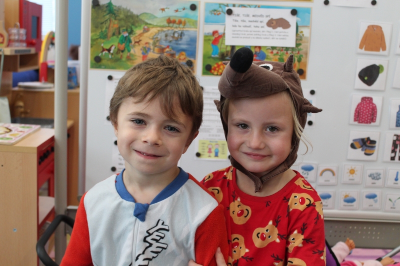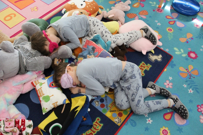 Třetí projektový den děti přišly ve spacím oblečení. Měly krásná pyžama, overaly i noční košili. Po přehlídce nočních úborů si děti zahrály pohybovou hru „Na vrabce a hlídače“ a šly na večeři, vlastně na svačinu. Potom potmě v noci hledaly maminku, také si zahrály na ježka. Před spaním si rozestlaly postýlky a podívaly se na pohádku „Čas jít spát“ z cyklu Prasátko Peppa. Také si vyrobily housenku.