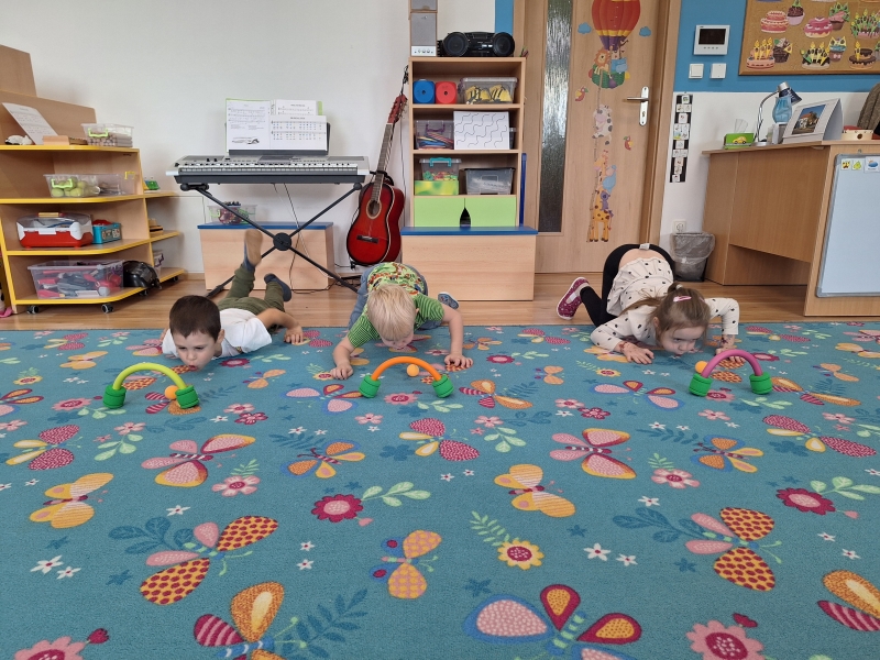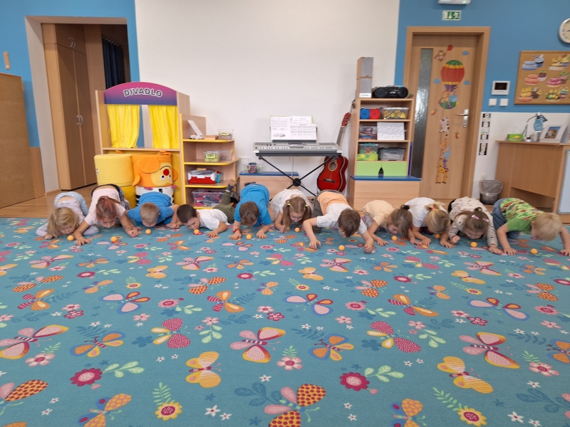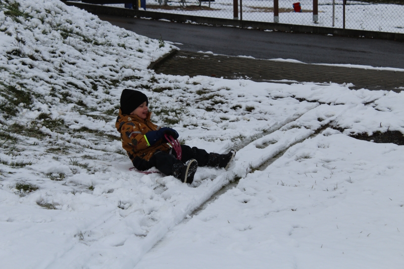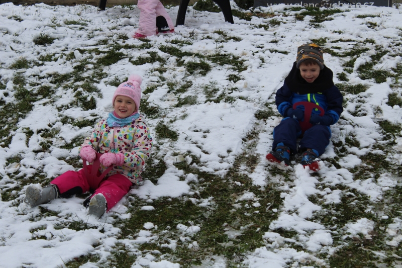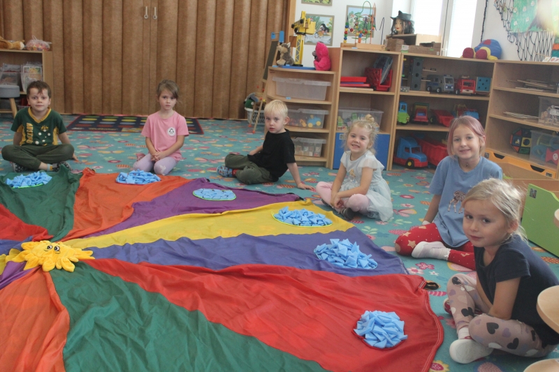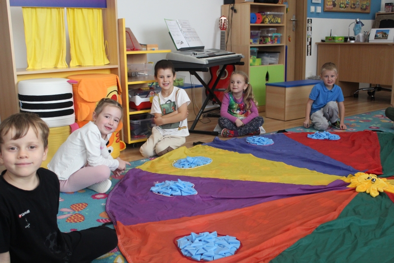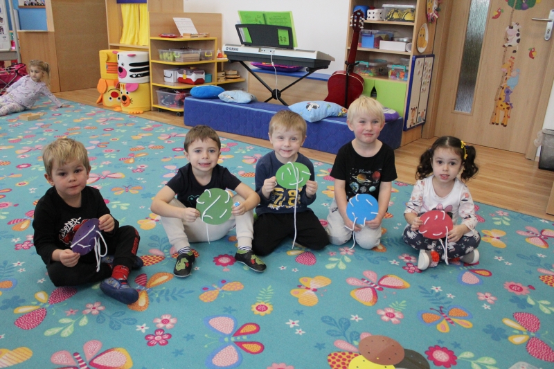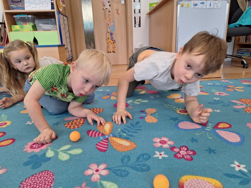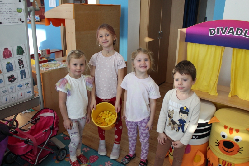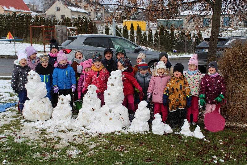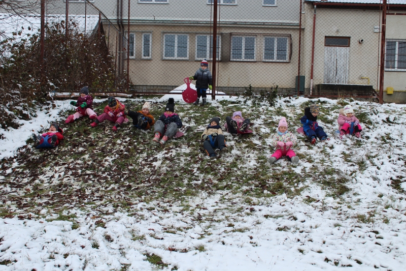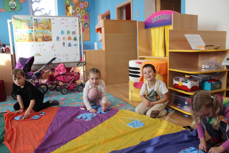 Malé děti plnily mráčky kapičkami, vytvořily z PET víček deštník, foukaly do míčku, skládaly puzzle. Velké děti foukaly do míčku a trefovaly se do branky, hrály hry s padákem, dělaly pokus s vodou, měly hodinu psaní, složily z různých stavebnic kamaráda. Společně děti hrály mnoho pohybových her, plnily několik jednodušších či složitějších úkolů a samozřejmě si jen tak hrály. Koncem listopadu napadl sníh a děti dováděly na kopci u školky. Do školky jsme zakoupili rautové stolky, které byly financovány společností Vild Art. Moc děkujeme.