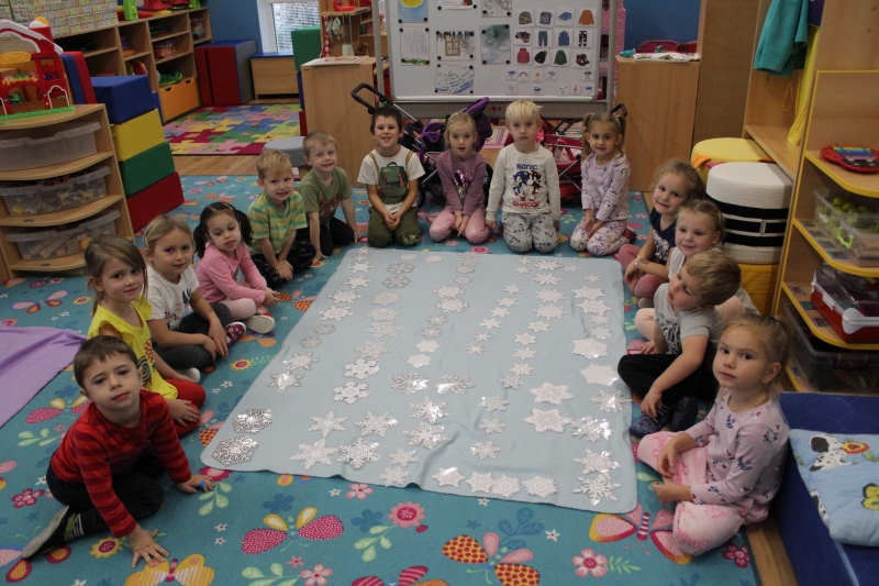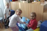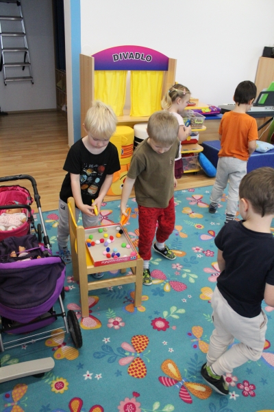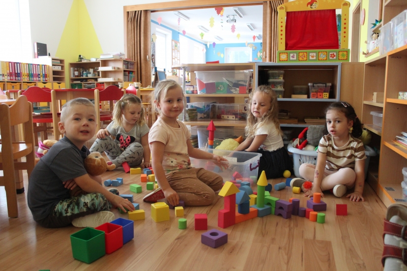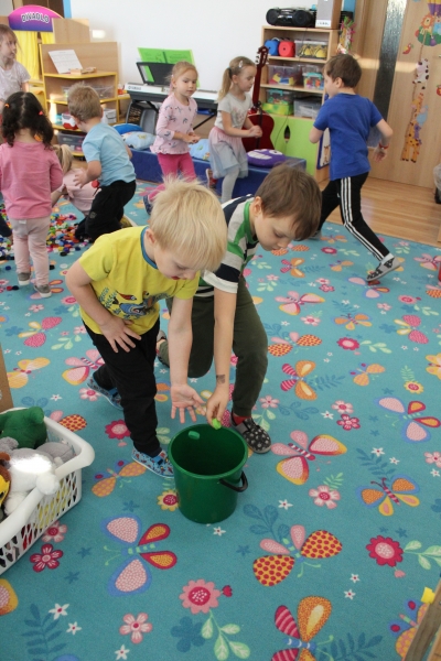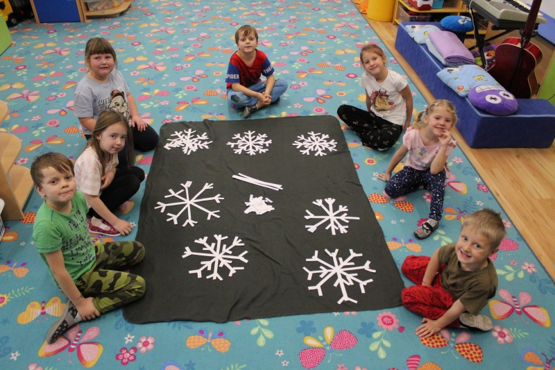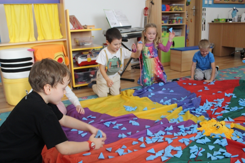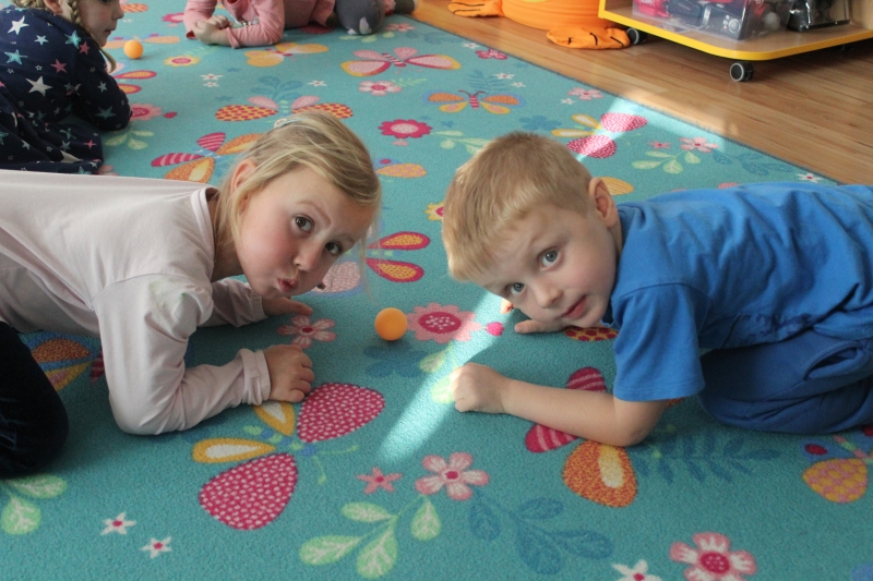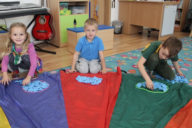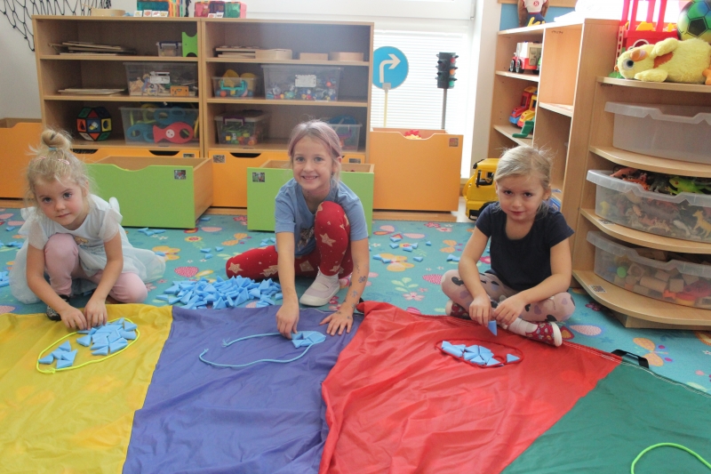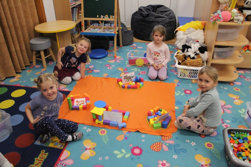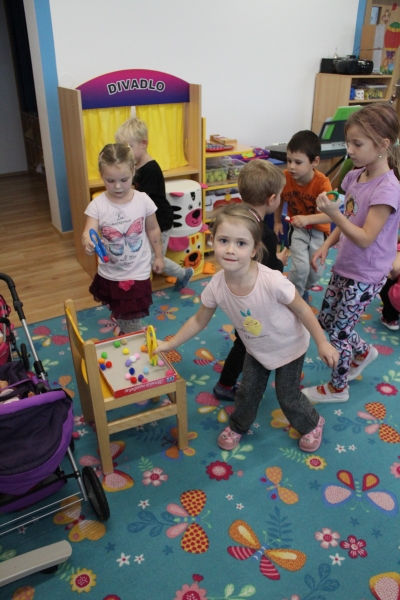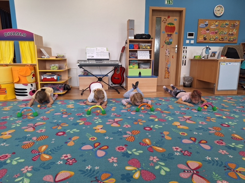 Malé děti plnily mráčky kapičkami, vytvořily z PET víček deštník, foukaly do míčku, skládaly puzzle. Velké děti foukaly do míčku a trefovaly se do branky, hrály hry s padákem, dělaly pokus s vodou, měly hodinu psaní, složily z různých stavebnic kamaráda. Společně děti hrály mnoho pohybových her, plnily několik jednodušších či složitějších úkolů a samozřejmě si jen tak hrály. Koncem listopadu napadl sníh a děti dováděly na kopci u školky. Do školky jsme zakoupili rautové stolky, které byly financovány společností Vild Art. Moc děkujeme.
