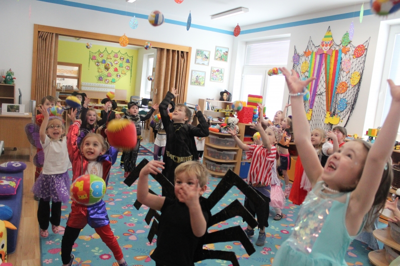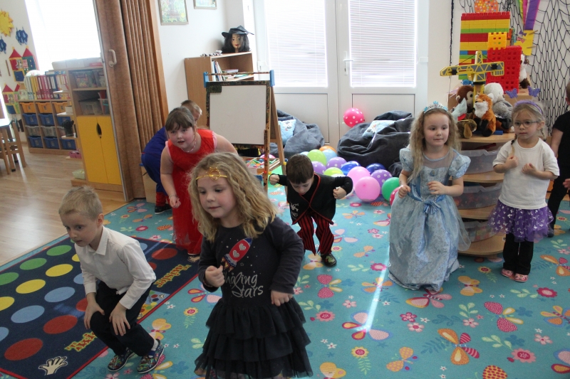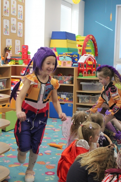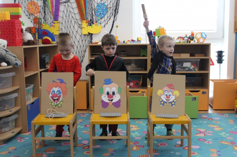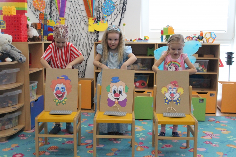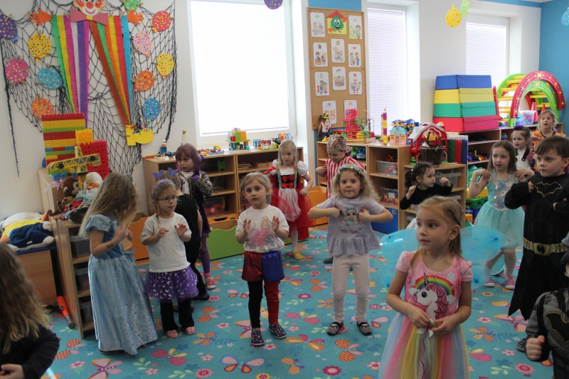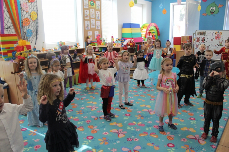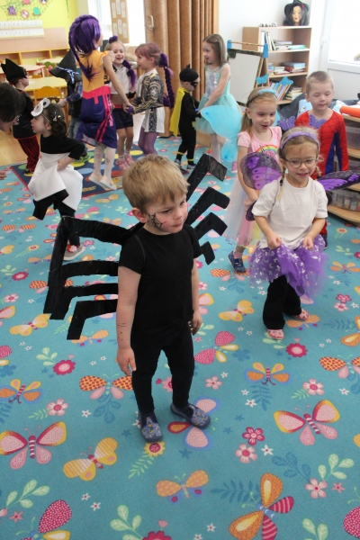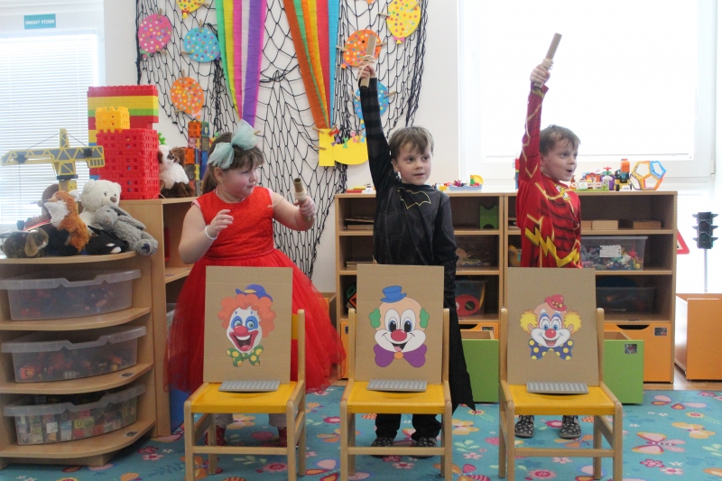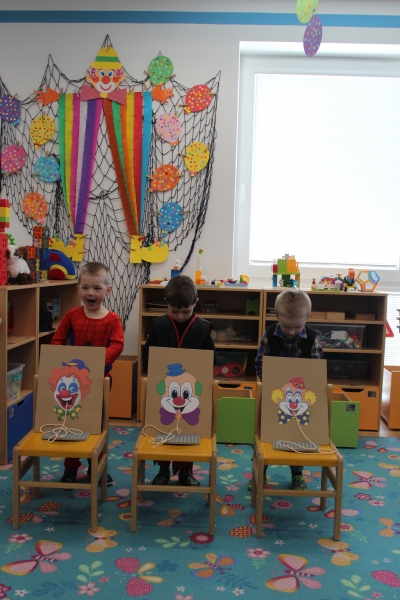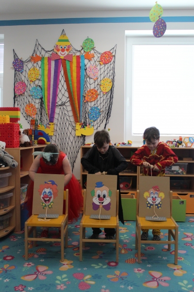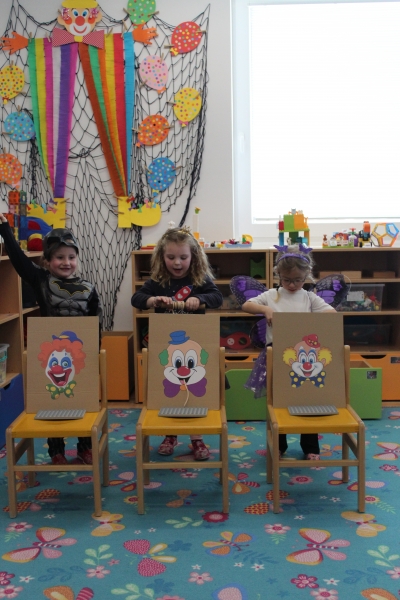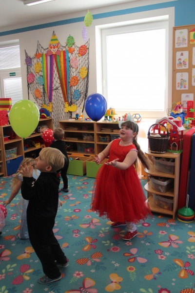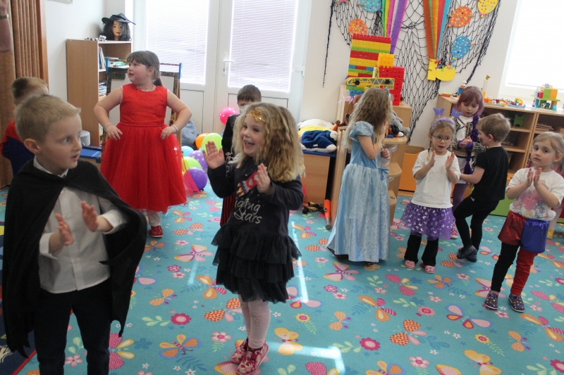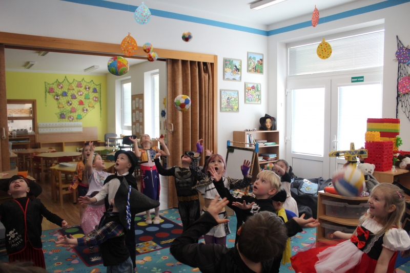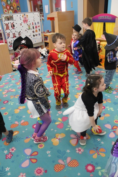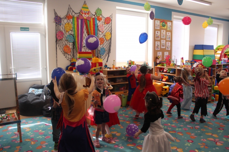 Na maškarní karneval přišly všechny děti v různých maskách. Děti zpívaly, dováděly a jedly dobroty. Hrály hru na medvěda, hry s míčky i s balonky, krmily klauna, tancovaly Labadu, Hoky koky a Ptačí tanec.