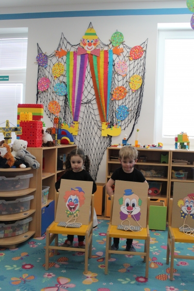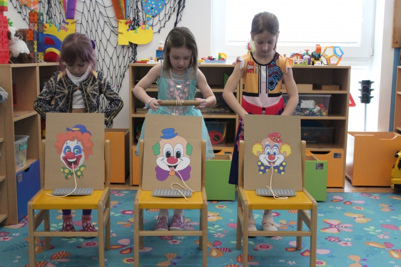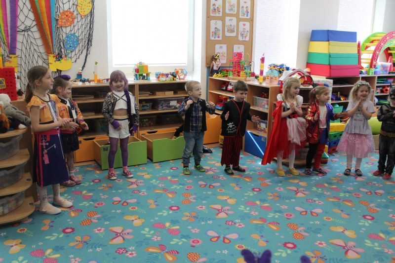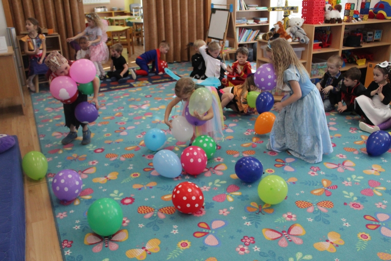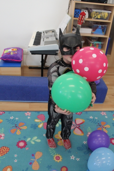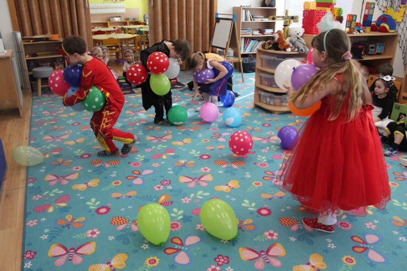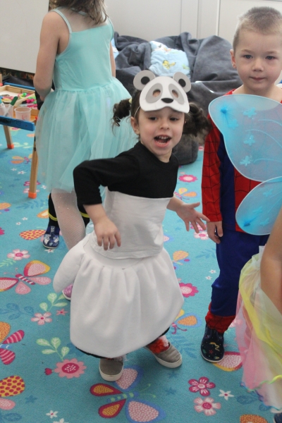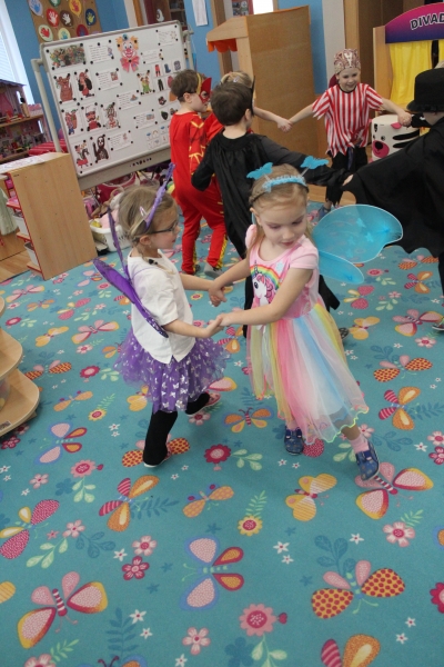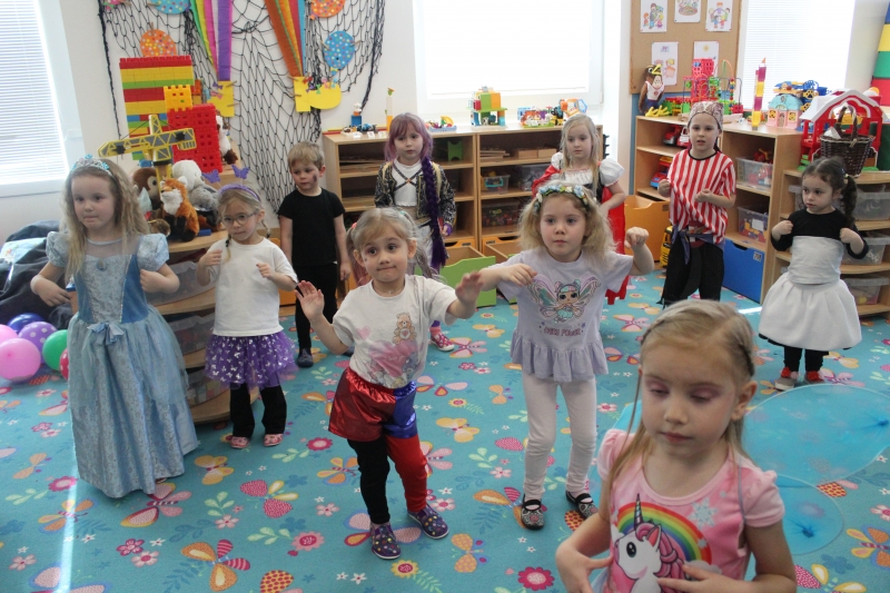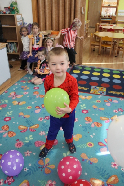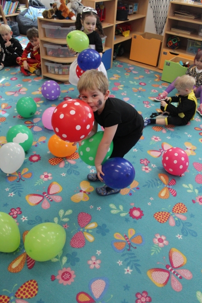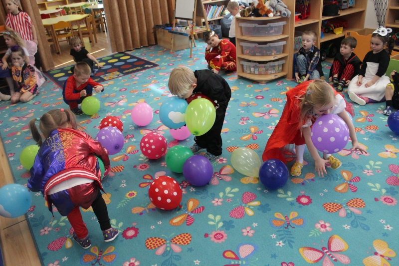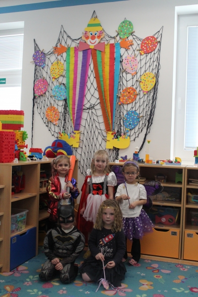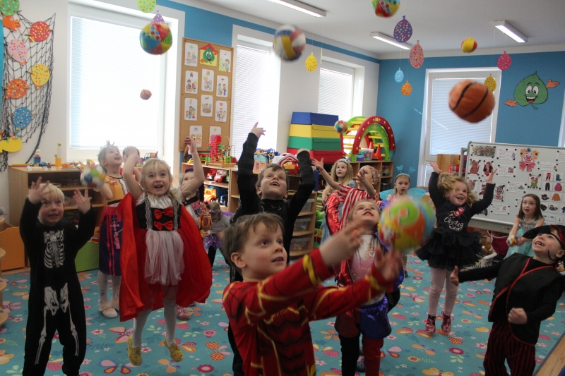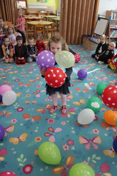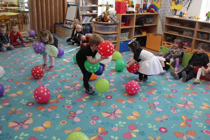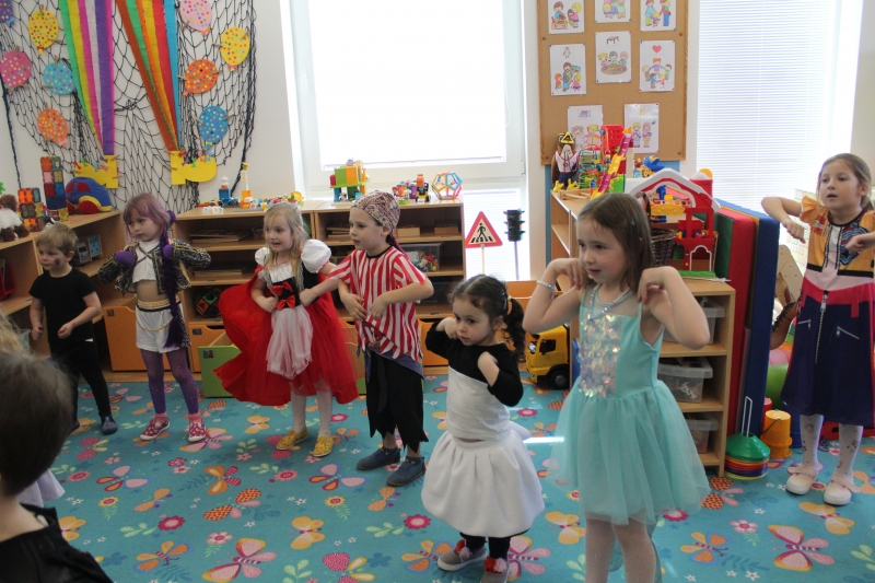 Na maškarní karneval přišly všechny děti v různých maskách. Děti zpívaly, dováděly a jedly dobroty. Hrály hru na medvěda, hry s míčky i s balonky, krmily klauna, tancovaly Labadu, Hoky koky a Ptačí tanec.