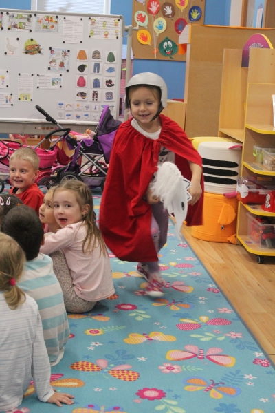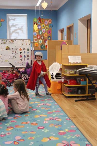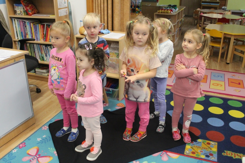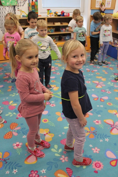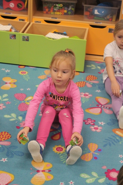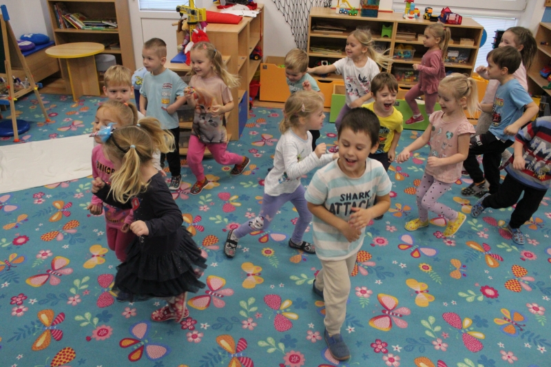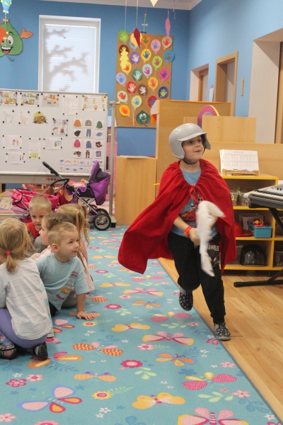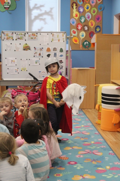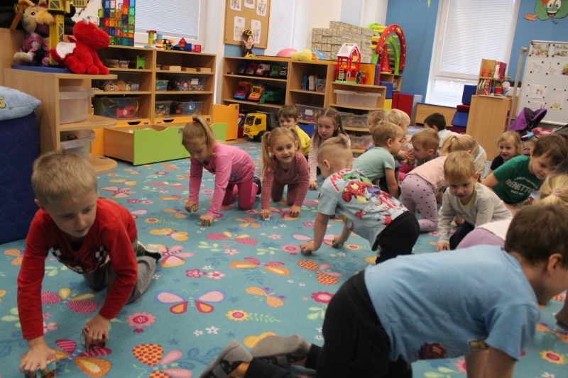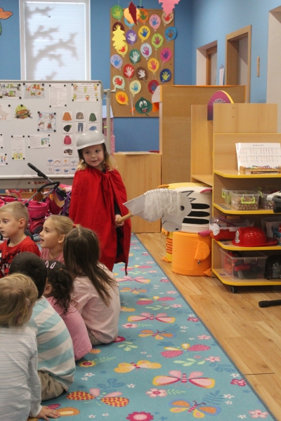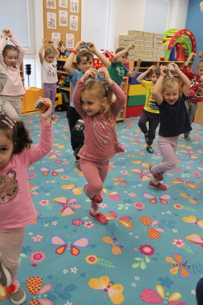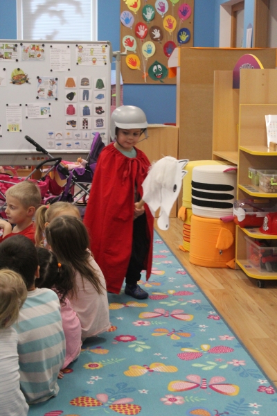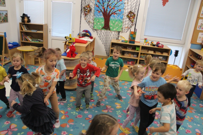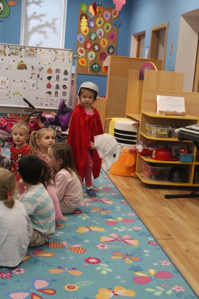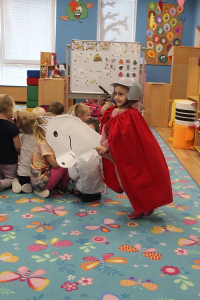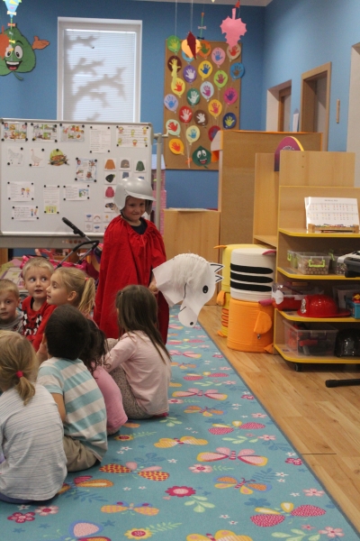 Děti si poslechly legendu o svatém Martinovi. Zahrály si několik pohybových her, zacvičily si jako koníci, pro koníky postavily stáj z cihliček, hledaly Martina a podívaly se na příběh o svatém Martinovi.